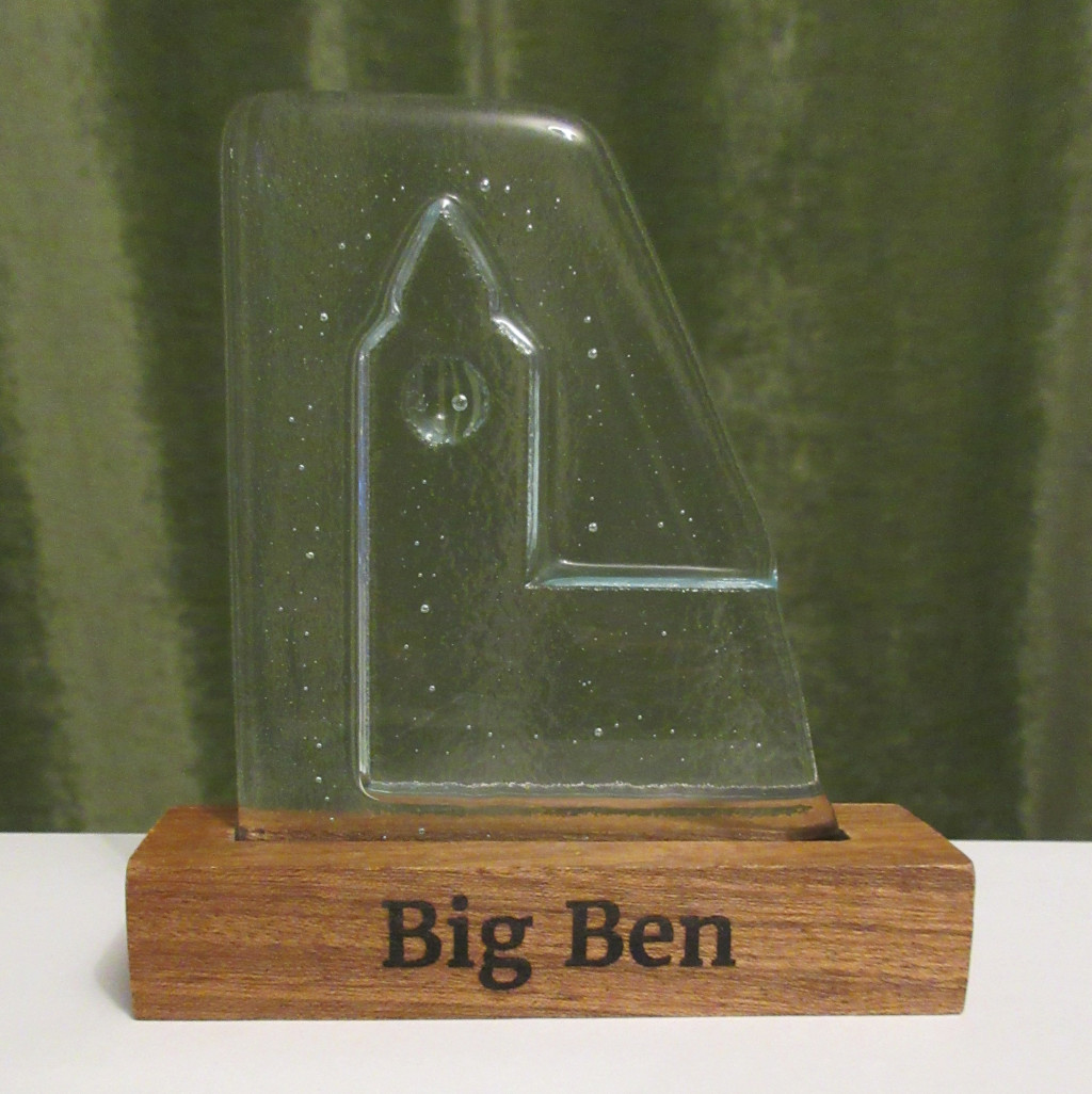A kiln-carving of Big Ben (the Elizabeth Clock Tower), freestanding in its stylish wooden stand