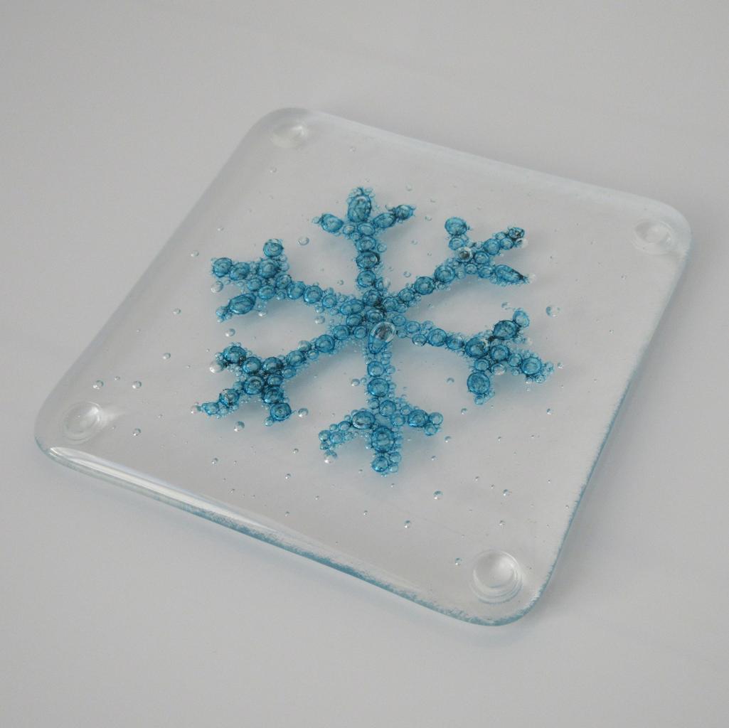 Snowflake coaster, made using copper oxide powder sandwiched between pieces of glass